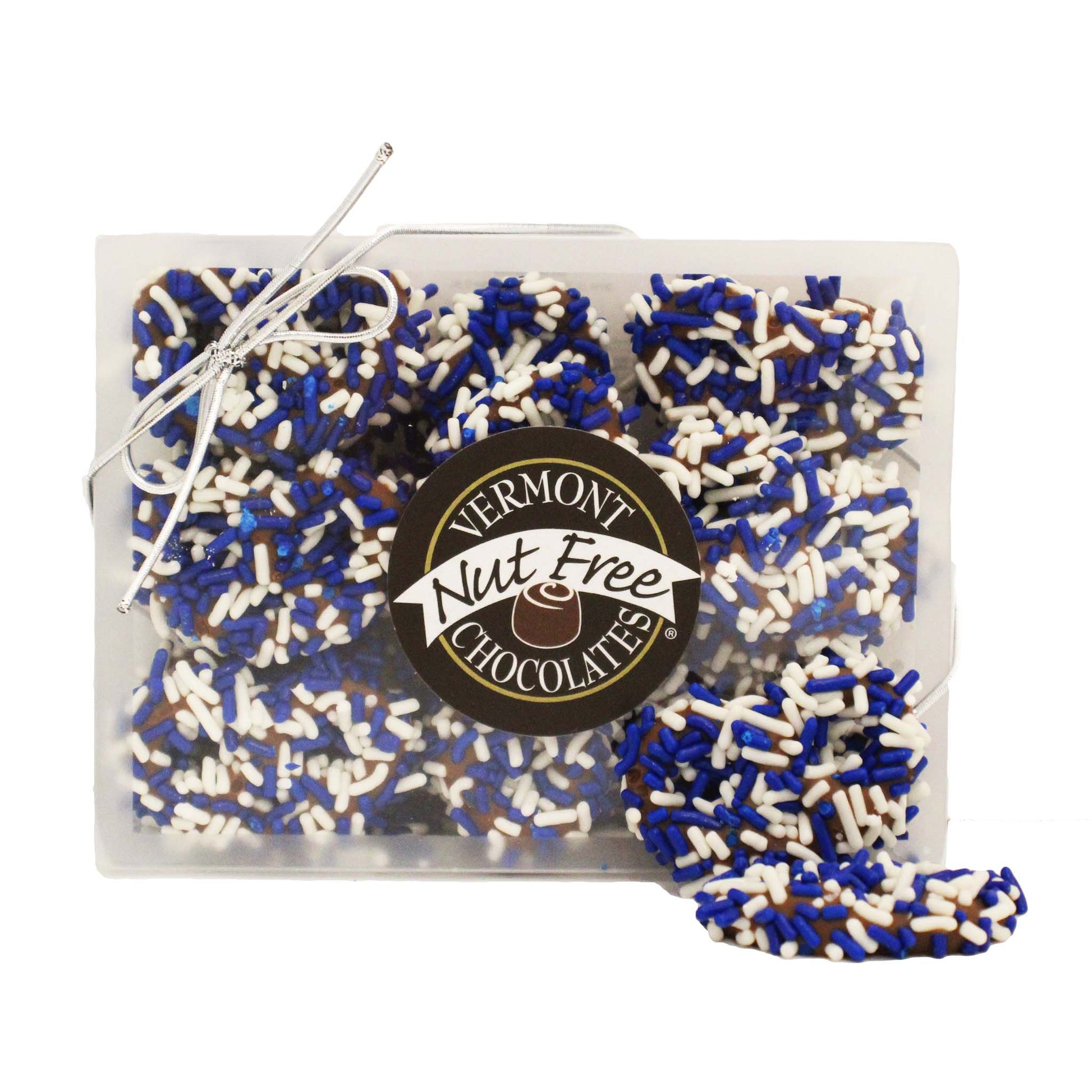 Our sweet and salty combination of pretzels and milk chocolate decorated with blue and white sprinkles. Packaged in a gift box. Perfect for Hanukkah! (6.8 oz)