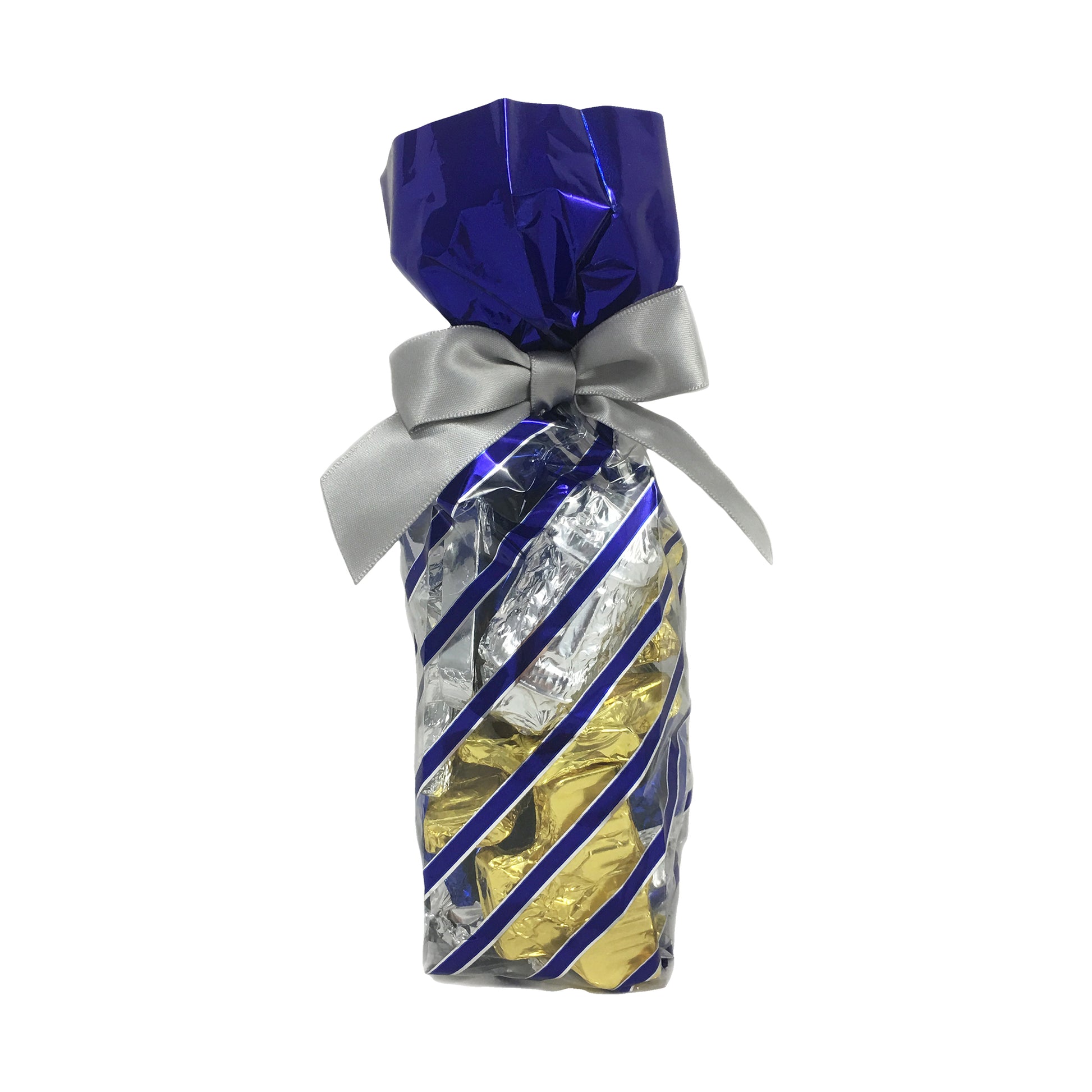 A decorative bag containing 18 solid, individually wrapped, chocolate Hanukkah shapes. Available in milk, dark, and crispy chocolate (6.8 oz - 7.2 oz).
